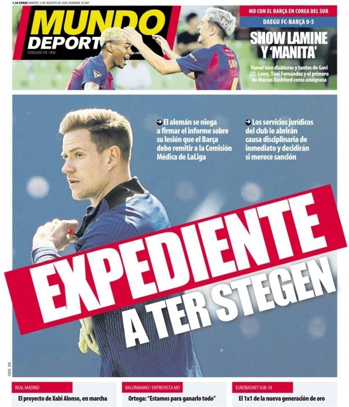特尔施特根在7月接受了腰部手术,将长期因伤缺席。然而,特尔施特根拒绝在医疗同意书上签字,这导致巴萨无法将其伤情报告提交给西甲医疗委员会。
